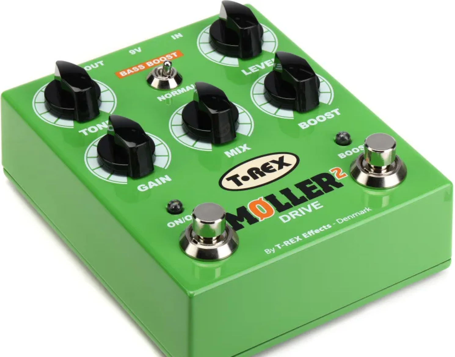 T-Rex Møller 2 delivers the same classic overdrive that made it's predecessor one of T-Rex’s most sought-after pedals. Named after Danish guitarist Knud Møller, for whom the original pedal was designed, Møller 2 features a more durable “Bass Boost” toggle switch and easier-to-read control knob graphics. The pedal is armed with a 0-20 db clean boost, as well as a mix control which lets you dial in the perfect balance between distorted and clean signals. Rolled all the way up and with distortion maxed, the pedal sounds just like a vintage tube amp at full volume. Roll the Mix knob back a bit, and your clean signal starts to get through; if you pick lightly or roll back your guitar volume, you get a stunning clean, softly-clipping sound that retains all the feel and dynamics of your original tone, only bigger, louder and richer. The boost function lets you dial in a solo level, whether the overdrive circuit is activated or not.