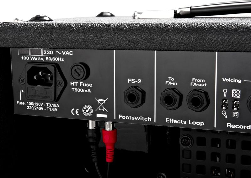 Beginning with four EL84 power tubes in Class A, a newly designed speaker and cabinet, three foot switchable channels, and two powerful voicing switches, the Koch Studiotone XL sound brings to mind the British valve amps of the 60s. The three channels (Clean, Overdrive & Overdrive+, all with their own volume control) take you from round warm tones to saturated EL84 overdrive & compression. The 2-way ‘Mid Shift’ allows you to boost the mid frequencies around 800 Hz and the 3-way ‘Bright’ switch allows you to cut or boost the high frequencies for fine-tuning the top end. Some of the big surprises are left for the back panel though, and a quick inspection reveals a serial effects loop, a recording output with microphone placement and cabinet style simulators, two line outputs (one unfiltered and one low level) and a ‘Headphone Out’ jack. Speaker outputs at 4, 8, and 16 Ohm allow for any combination of speakers and the built in Power Soak snd Speaker on/off switch allow the amp to be played with the speaker turned off for recording or headphone use. There is also a short scale spring reverb tank, with front mounted level adjustment.